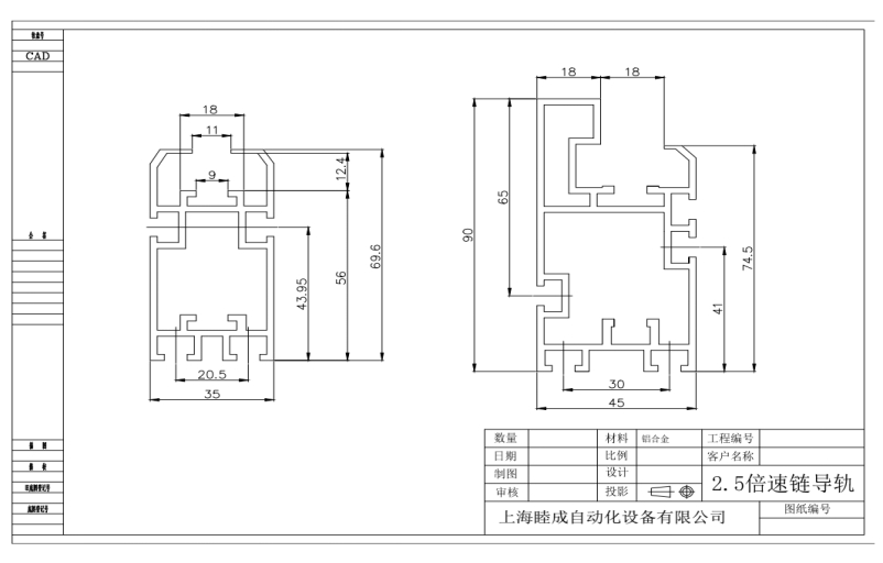 倍速链输送机主要分为2.5倍速链输送机以及3倍速链输送机,2.5倍速链输送机专用导轨图纸为: